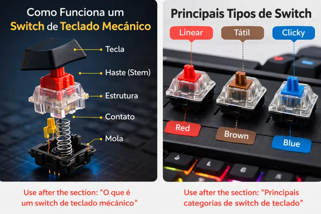 Escolher um teclado mecânico envolve mais do que aparência ou iluminação. O tipo de switch define como cada tecla responde quando você digita ou joga.